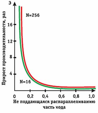Пример. Если 9/10 программы исполняется параллельно, а 1/10 по-прежнему последовательно, то ускорения более, чем в 10 раз получить в принципе невозможно вне зависимости от качества реализации параллельной части кода и числа используемых процессоров (ясно, что 10 получается только в том случае, когда время исполнения параллельной части равно 0).