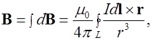 - радиус-вектор, проведенный из точки расположения элемента тока в точку наблюдения, где определяется индукция