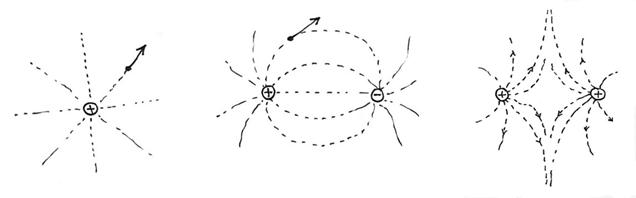 На рисунке изображены линии точечного заряда, линии пары равных по величине зарядов. Видно, что линии всегда начинаются на положительных зарядах и заканчиваются на отрицательных (или уходят в бесконечность где, возможно, тоже есть заряды). Это наводит на мысль, что суммарный электрический заряд всего мира равен 0, хотя это ничем не обосновано. Вблизи каждого из зарядов линии почти такие же, как у одного заряда, но в точках, которые удалены от зарядов на сравнимые расстояния, поле формируется обоими зарядами.