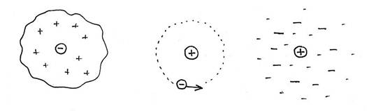 Важнейший опыт по изучению структуры атома поставил физик Эрнест Резерфорд. Логика эксперимента, до сих пор используемая при изучении вещества, соответствует логике ребенка, пытающегося проникнуть в закрытую коробочку. Он должен сломать ее, разрушить. В качестве объекта исследования был взят атом золота в тонкой фольге, а в качестве средства исследования – пучок быстро летящих альфа-частиц. Предполагалось, что они будут отклоняться на небольшие углы слабым полем, создаваемым положительным зарядом атома и его электронами. С большинством частиц было примерно так, однако примерно одна из 8000 частиц, будто наткнувшись на невидимое препятствие, разворачивалась и летела назад со своей огромной скоростью. Резерфорд сравнил это со стрельбой из пушки по листу бумаги, когда пушечное ядро отскакивает и летит назад. Здесь нужно вспомнить закон Кулона. Напряженность поля точечного заряда может быть колоссально большой, если мы приблизимся к нему на очень малое расстояние. Резерфорд предположил, что положительный заряд атома не «размазан» по капле размером 10-8 см, а сосредоточен в центре атома в малой области 10-13 см, которую он назвал ядром. Видно, что ядро в 100000 раз меньше самого атома, а электроны находятся где-то на его границе. Если альфа-частица летит прямо на ядро, то она подлетает к нему очень близко, кулоновские силы отталкивания велики, и частицу отбрасывает назад. Попасть «на ядро» маловероятно, поэтому большинство частиц пролетают почти без отклонений. Эту модель атома назвали планетарной (рис 2), поскольку в центре находится положительное ядро, а вокруг него на большом расстоянии подобно планетам летают (неподвижно стоять они не могут – упадут на ядро) электроны. На рисунке приведена модель Резерфорда атома Н. Химические свойства атома, очевидно, обусловлены свойствами электронных оболочек и взаимодействием их. Например, свойство атомов некоторых элементов «перетягивать» на себя электроны в молекуле, химики называют электроотрицательностью. Если у атома оторвать один электрон, оставшаяся его часть будет заряжена положительно с зарядом +е. Это – положительно заряженный ион. Он тоже может быть носителем заряда при протекании электрического тока.