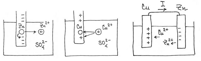 Рассмотрим раствор CuSO4 с погруженным в него цинковым стержнем (электродом). В силу определенных химических свойств цинка по отношению к раствору медного купороса, цинк начнет растворяться в нем. Но он не может перейти в раствор в виде молекул, а лишь в виде положительно заряженных ионов Zn2+ имеющих заряд +2е, поэтому сам электрод будет заряжаться отрицательно. Такой электрод назовем катодом. Однако постепенно растворение прекратится – дальнейшему переходу в раствор ионов Zn2+ будет мешать накопленный на катоде отрицательный заряд.