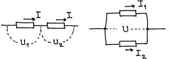 При параллельном соединении полный ток разветвляется на токи I1 и I2, причем по закону сохранения заряда I=I1+I2. Иначе в узле будет накапливаться заряд. Напряжения на проводниках одинаковые. Поэтому