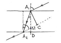 Угол α обозначен одной дугой, β- двумя. A1D=d. Легко сообразить, что луч должен выйти из пластины под углом α, то есть, параллельно падающему лучу. Однако он сместится - преломится. Найдем величину смещения, то есть длину A1C=x. Обозначим A2D=y. MD=z Теперь немного вычислений: