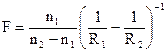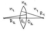На рисунке показана двояковыпуклая линза с радиусами кривизны R1 и R2. Первый радиус отложен направо, поэтому он положителен, второй отложен от вершины налево – он отрицателен. Показатель преломления материала линзы n2, а окружающая ее среда имеет показатель преломления n1.
