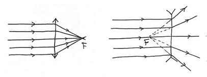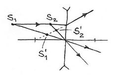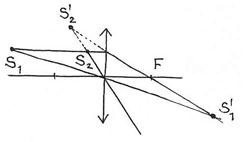 Луч, параллельный оптической оси, отклонится так, что его продолжение пройдет через задний фокус (который находится спереди от линзы). Видно, что для положений источника s1 и s2 изображения мнимые. Если луч идет в направлении переднего фокуса (который на самом деле сзади линзы), он преобразуется линзой в параллельный.