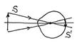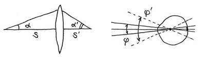 Пусть изображение получается в точке s’, причем расходящийся под углом α пучок собирается в пучок, сходящийся под углом α’. Важность того, что α’> α, видна из следующего рисунка. Глаз, который рассматривает справа изображение предмета, видит более широкий пучок лучей, расходящийся от него, и, следовательно, формирует на сетчатке большее по размеру окончательное изображение предмета. Таким образом, если угол α мал, что обычно бывает при рассмотрении мелких или удаленных предметов, то оптическая система позволяет его увеличить, разрешая все более мелкие детали.