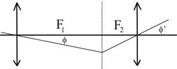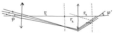 Точка фокальной плоскости, в которой собирается наклонный пучок определяется центральным лучом пучка, идущим без преломления через первую линзу. Чтобы определить угол прохождения этого пучка через вторую линзу, достаточно рассмотреть вспомогательный источник в этой точке фокальной плоскости. Испускаемые им лучи превратятся после второй линзы в параллельный пучок. Он будет параллелен центральному лучу второй линзы (рисунок). Значит пучок, нарисованный на верхнем рисунке пойдет под тем же углом φ’ к оптической оси. Видно, что