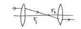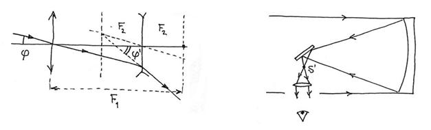 На рисунке показан ход лучей в трубе Кеплера, состоящей из двух собирающих линз, задний фокус объектива совпадает с передним фокусом окуляра. Предположим, мы рассматриваем две точки удаленного тела, например Луны. Первая точка испускает пучок, параллельный главной оптической оси (не показан), а вторая, нарисованный на чертеже косой пучок, идущий под малым углом φ к первому. Если угол φ меньше 1’, то изображения обеих точек на сетчатке сольются. Нужно увеличить угол расхождения пучков. Как это сделать – показано на чертеже. Косой пучок собирается в общей фокальной плоскости, затем расходится. Но затем преобразуется второй линзой в параллельный. После второй линзы этот параллельный пучок идет под гораздо большим углом φ’ к осевому пучку. Простые геометрические рассуждения позволяют найти приборное (угловое) увеличение.