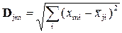 где D jм – расстояние до центра j–го кластера (нейрона) до m-го наблюдения, x mi – i–ая компонента входного вектора признаков m-го наблюдения,