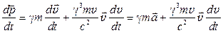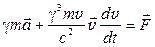 релятивистский импульс переходит в классический и релятивистское уравнение движения переходит в классическое. Хотя по форме записи классическое и релятивистское уравнения движения похожи, из релятивистского уравнения получаются совершенно новые следствия. Действительно, продифференцируем релятивистский импульс по времени: