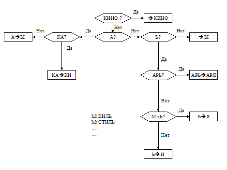 С точки зрения программирования на алгоритмических языках достоинства подобного представления очевидны — эта блок-схема без затруднений переводится в текст программы, например, на языке Ассемблера или С++. Однако само составление подобной блок-схемы при появлении существительных новых типов становится, очевидно, все более и более утомительным занятием. Для иллюстрации этого предположим, что дана