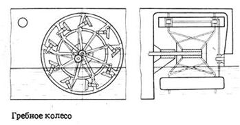 Гребное колесо (колесный движитель) – колесо, состоящее из 6 – 12 поворотных лопастей (плиц), размещенных по метталической поверхности колеса и шарнирно связанных с эксцентриками тяги (рис.3). Гребное колесо закреплено на валу, размещенном обычно вдоль мидель-шпангоута, перпендикулярно к ДП судна, над поверхностью воды. На мелкосидящих судах гребные колеса имеют высокий КПД (до 96 %), однако они легко повреждаются, требуют постоянного ремонта и более чем в 2 раза увеличивают габаритную ширину судна.