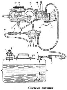 В систему питания и смесеобразования двигателей подвесных лодочных моторов входят топливный бак, гибкий соединительный топливный шланг с ручной подкачивающей грушей, топливный насос, карбюратор и соединительные шланги (рис. 13). Более просто устроена система питания маломощных одноцилиндровых подвесных лодочных моторов («Салют», «Стрела») со встроенным бензобаком и поступлением топлива самотеком. Карбюраторы поплавкового типа оборудованы системами и устройствами, обеспечивающими обогащение топливной смеси при пуске двигателя, работу в эксплуатационном диапазоне нагрузок и быстрый переход от малой нагрузки к полной, стабильность качественного состава смеси при полной нагрузке и экономичность. Карбюратор мотора «Салют-М» — с центральной поплавковой камерой и цилиндрическим золотником. Карбюраторы КЗЗБ («Ветерок-8Э») и КЗЗВ («Ветерок-123») — горизонтального типа, с боковым расположением поплавковой камеры — максимально унифицированы между собой и отличаются только размерами диффузора.