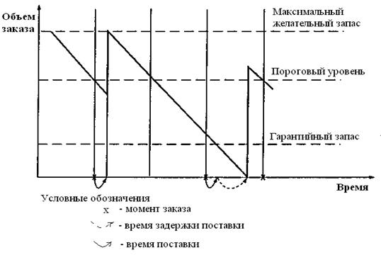 Пороговый уровень запаса в системе «минимум-максимум» играет роль «минимального» уровня. Если в установленный момент времени этот уровень пройден, т.е. наличный запас равен пороговому уровню, или не достигает его, то заказ оформляется. В противном случае заказ не выдается, и отслеживание порогового уровня, а также выдача заказа будут произведены только через заданный интервал времени.