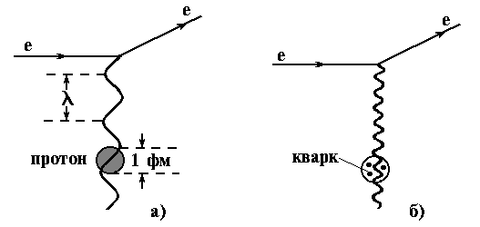 Энергетическое разрешение опыта определяется длиной волны виртуального фотона l=h/q (q - импульс виртуального фотона, т.е. переданный протону импульс). Если изучать рассеяние электронов с энергией»200 МэВ на большие углы (близкие к 180o), то длина волны виртуального фотона будет»3 фм и протон будет «освещаться» длинноволновым фотонным лучом (рис.10.16а). Поскольку длина волны фотона больше размера протона, последний будет казаться точечным бесструктурным объектом. Рассеяние электрона на таком объекте будет упругим (без изменения внутреннего состояния протона).