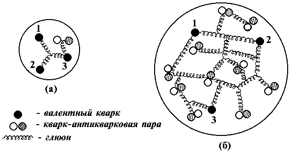 Если увеличить переданный протону импульс q, то это будет соответствовать уменьшению длины волны виртуального фотона и повышению разрешающей способности опыта (рис.10.16б). Если довести разрешение (l) до 0.1 размеров протона (0.1 фм), то коротковолновым фотонным лучом будут «освещаться» отдельные составляющие протона - кварки и глюоны. Будет «видно», что протон состоит из трех кварков (в дальнейшем называемых валентными), между которыми «проскакивают» глюоны. Будет видно, как иногда глюон рождает виртуальную кварк-антикварковую пару. Наблюдаемая картина может быть представлена рис.10.17а.
