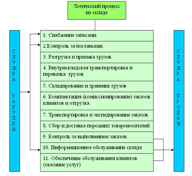 Логистический процесс на складе весьма сложен и представляет собой упорядоченную во времени последовательность логистических операций, интегрирующих функции снабжения запасами, грузопереработки (или обработка грузов) и физического распределения (транспортировки) заказов.