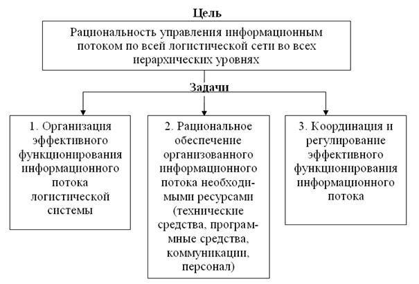 Своей главной цели обеспечения конкурентоспособности организации бизнеса на рынке логистика добивается посредством управления потоковыми процессами на основе правила«семи R-s» логистики. Очевидно, что главная цель информационной логистики – оптимально обеспечить этот процесс необходимой информацией. Таким образом, цель информационной логистики можно сформулировать как рациональное управление информационным потоком по всей логистической сети и на всех иерархических уровнях. Для достижения этой цели необходимо обеспечить реализацию совокупности трех взаимосвязанных задач, определяющих области и целевую направленность достижения цели (рис.9.2).