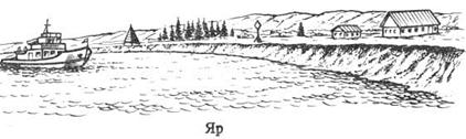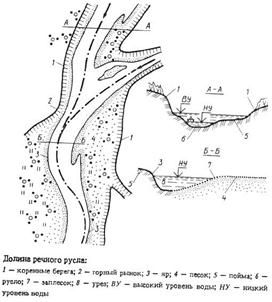 ЯР - невысокий обрывистый, как правило, вогнутый пойменный берег русла реки (рис.4). На криволинейных участках русла возникают поперечные течения, направленные у поверхности под утлом к вогнутому берегу, а у дна - в сторону выпуклого. Дойдя до берега, поверхностные струи поворачивают к дну и размывают его. Донные поперечные течения захватывают продукты размыва и переносят их к выпуклому берегу, где из-за небольшой продольной скорости потока происходит отложение насосов. Этот процесс приводит к тому, что глубины у вогнутого берега наибольшие, а у выпуклого -наименьшие. Яр имеет два плеча: верхнее и нижнее. Плечи, определяя начало и конец яра, совпадают с началом и концом его размыва, а также с устойчивыми большими глубинами, где преимущественно проходит судовой ход.