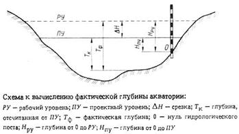 УРОВЕНЬ ВОДЫ - высота поверхности воды в водном объекте над условной горизонтальной плоскостью сравнения (рис.5). Наиболее важными являются следующие У.в.: естественный -уровень в водотоках и водоемах в их естественном состоянии, т.е. не подверженный влиянию гидротехнических сооружений; мертвого объема - наинизший уровень, до которого допускается опорожнение водохранилища; наинизший судоходный (НСУ) - условно низкий (меженный) уровень с заданной обеспеченностью гарантированной глубины судового хода в естественных условиях (с учетом возможного дноуглубления); нормальный подпорный (НПУ) — наивысший подпорный уровень, который может поддерживаться при нормальных условиях эксплуатации гидротехнических сооружений; подпорный (ПУ) - уровень, образующийся в водотоке или водохранилище в результате подпора; подпорный (ПУ) -условно низкий уровень с заданной обеспеченностью, где под обеспеченностью понимается продолжительность периода (в процентах), когда уровень воды был выше или соответствовал данной его отметке, (от ПУ показываются значения глубин на навигационных картах рек, сообщается высота ферм в пролетах мостов, устанавливается гарантированная глубина; ПУ устанавливают на основании многолетних наблюдений так, чтобы время меньшего уровня воды составляло не более 10 % продолжительности навигации на реках с неразвитым судоходством и до 3 % на реках с развитым; высота ПУ приводится в предисловии к навигационным картам); рабочий (РУ) - уровень в момент его измерения; расчетный судоходный (РСУ) - судоходный уровень, определяемый расчетом, от которого отсчитывают надводную высоту подмостового габарита; срезочный - условный уровень, к которому приводят глубины, измеренные при различных рабочих уровнях воды; форсированный подпорный (ФПУ) -уровень выше нормального, временно допускаемый в чрезвычайных условиях эксплуатации гидротехнических сооружений.