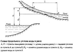 УКЛОН ПОВЕРХНОСТИ ВОДЫ- отношение падения уровня воды на данном участке реки к длине этого участка. Здесь падение уровня воды — разность между отметками в двух пунктах, расположенных вдоль реки в начале и конце данного участка (рис.6). Падение также может характеризоваться величиной (обычно в сантиметрах), приходящейся на 1 км длины участка реки. Например, среднее падение р. Оби на 1 км равно 4 см. Уклон выражается безразмерной величиной (десятичной дробью): I = (H1-H2)/ l - Меженные уклоны Волги у Нижнего Новгорода равны 0,00007, Северной Двины у Берез-ников - 0,00003, Енисея у Красноярска - 0,00002 и т.д.