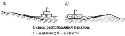КАНАЛ (правило 3) - искусственный открытый водовод в земляной выемке или насыпи (рис.7). По назначению К. разделяют на соединительные, обходные и подходные. Соединительные К. служат для соединения водным путем рек различных бассейнов, а также для соединения рек, озер и морей (например, каналы им. Москвы, Волго-Донской, Беломорско-Балтийский). Обходные К. предназначены для обхода судами озер, на которых бывают сильные штормы, а также центральных частей больших городов (Приладожские, Прионежские и др.). Подходные К. служат для подхода судов к портам, населенным пунктам и промышленным предприятиям, находящимся в стороне от основного судового хода (например, каналы в Архангельске, Санкт-Петербурге и др.).