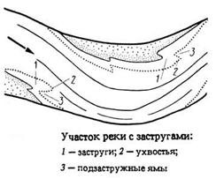 Заструга - скопление Н. в форме крупных гряд, примыкающих к песчаному берегу (рис.8). Конец заструги называют ухвостьем, а понижение дна между застругами-подзастружной ямой. Размеры заструг зависят от формы русла, глубины и скорости течения. Иногда крупные заструги тянутся до противоположного берега. Высота заструг на больших реках достигает 2 м. Закономерности роста и перемещения заструг такие же, как и гряд. Над застругами обычно неровное течение, вызывающее рыскливость судов.