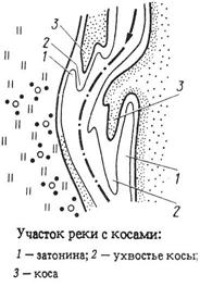 Коса представляет собой песчаную невысокую отмель, вдающуюся в русло длинным клином (рис.9). На реках косы примыкают обычно к выпуклым песчаным берегам. Косы образуются из крупных заструг в результате их постепенного роста и перемещения.