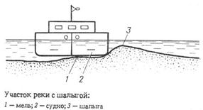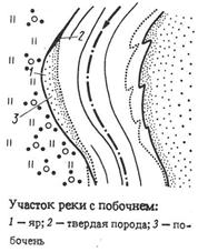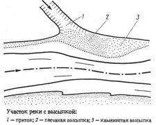 В меженное время поток, размывающий яр, иногда встречает твердую породу и отклоняется к противоположному берегу. Ниже твердой породы образуется тиховод, где откладываются Н. и формируются побочень, высыпка (рис.11) — отложения из крупных Н. в местах впадения в реку небольших притоков или выходов оврагов. Ниже высыпки в области тихого течения может образоваться побочень. В результате местных русловых переформирований на перекатах с легкоподвижными Н., а также за судами, вставшими на мель на перекате, или за затонувшими крупными предметами возникают-шалыги, отдельно лежащие подводные отмели, образовавшиеся на судовом ходу или перекате (рис.12).
