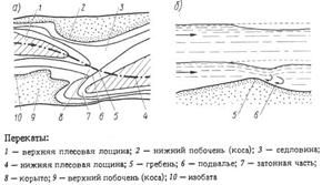 Основные элементы П. (рис.13): верхний и нижний побочни (косы); верхняя и нижняя плесовые лощины; седловина - вал из наносов, соединяющий верхнюю и нижнюю косы; корыто - глубокая часть седловины, где обычно проходит судовой ход; напорный верхний скат - верховая пологая часть седловины; подвалье (тыловой или нижний скат)— низовая часть седловины, более крутая, чем напорный скат; гребень - верхняя кромка подвалья, имеющая наименьшую глубину; затонная часть - верхняя часть нижней плесовой лощины, находящаяся за ухвостьем верхней косы (П. могут не иметь затонной части, в этом случае плесовые лощины не заходят одна за другую); выбоина - разработанное потоком углубление в верхней части нижней косы, направленное своим устьем против течения. На планах П. глубины изображают изобатами - линиями равных глубин. Цифра на изобате показывает глубину от проектного уровня, при котором пересечение поверхности воды с берегами образует линию уреза воды, обозначающую конфигурацию русла реки.