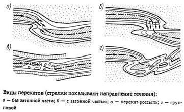 2. На ПЕРЕКАТ с затонной частью плесовые лощины заходят одна за другую. Корыто расположено под большим углом к направлению русла, судовой ход круто переваливает от одного берега к другому. Этот ПЕРЕКАТ неустойчивый. При низком уровне воды иногда происходит промыв корыта почти поперек русла. При дальнейших переформированиях ПЕРЕКАТ корыто может получить еще большее искривление и принять вид буквы S. Часть водного потока сливается на ПЕРЕКАТ по кратчайшему пути — из верхней плесовой лощины в нижнюю, в связи с чем свал воды направлен к затонной части. При низком уровне воды на ПЕРЕКАТ создается сильное свальное течение, направленное к нижней косе. ПЕРЕКАТ данного типа (особенно с развитой затонной частью) из-за узкого судового хода с крутым перевалом, небольшой глубины и сильного свального течения затруднителен для движения судов.