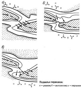 3. Неровное (искривленное или неопределенной формы) подвалье создается двумя застругами или ухвостьями кос, которые заходят одно за другое. Такое подвалье очень неустойчиво, течение на нем неровное, возле каждой косы создается различное направление слива воды. При большой подвижности наносов образуется подвалье неопределенной формы. Такое подвалье очень искривлено или не имеет ясно выраженного очертания; оно также очень неустойчиво, поэтому для судоходства неровные подвалья наиболее неблагоприятны.