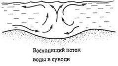 Течение воды в реке имеет особенности, иногда их называют неправильными течениями. Тиховод — медленное течение, образующееся за выпуклыми берегами, крупными песчаными отложениями в русле и т.п. При движении судна вверх для увеличения скорости, где это возможно, следует идти по тиховоду. Суводь - водное пространство с вращательным движением воды, обычно находящееся за выступами берегов, мысами, выпуклыми берегами, сильно вдающимися в русло (рис.16). В этих местах течение, с большой скоростью обтекая берег, встречает на своем пути выступ и создает перед ним подпор воды и повышение уровня. Проходя выступ, водный поток отклоняется от него и по инерции проходит некоторое расстояние. За выступом уровень воды понижен, из-за чего в низовой части суводи вода затягивается из основного потока, а в верхней части, наоборот, - из области суводи в основную струю потока. Этот процесс происходит непрерывно и вызывает вращательное движение воды.