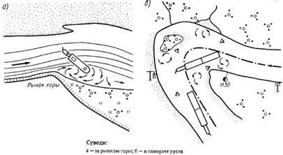 У вогнутых берегов в крутых изгибах русла реки также образуются суводи (рис.17). В отличие от суводей, расположенных за выступами берегов, здесь нисходящие токи воды спускаются в восходящий поток воды в суводи центре суводи ко дну и растекаются в стороны. Этот тип суводи с отчетливо выраженной воронкой на поверхности воды иногда называют омутом. Суводи у вогнутых берегов образуются в тех случаях, когда нарушается плавное обтекание берегов излучины.