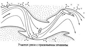 Прижимное течение создается у берега на участке реки, где слив воды направлен к берегу. Например, на закруглениях русла прижимное течение возникает у вогнутого берега, так как вода вследствие инерции стремится сохранить прежнее прямолинейное направление, но, встречая на своем пути препятствие в виде вогнутого берега, прижимается к нему (рис.19). На участках с прижимным течением происходит раскат судов в сторону берега.