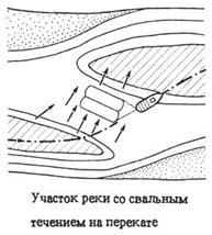 Свальное течение - слив воды, направленный под углом к судовому ходу (рис.20). Свальное течение возникает из-за разности в уровнях воды по ширине реки. На перекатах такие течения создаются в результате подпора потока седловиной переката, поэтому они направлены из верхней плесовой лощины в затонную часть нижней плесовой лощины (см. Перекат). Смещая суда с оси судового хода, свальные течения могут вызвать навал судов и плотов на отмели, опоры мостов и т.п.