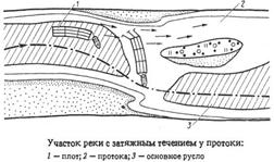 Затяжное течение возникает у входа в протоки (рис.21). Особенно сильны затяжные течения во время половодий, когда расход воды в протоках значительно возрастает. Затяжное течение может вызвать навал судов на остров. На характер течения влияют также мосты, дамбы, плотины, сооружения в русле и др.