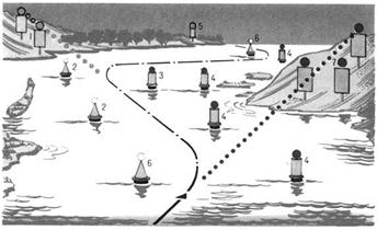 1 — створы осевые; 2 — буи левой кромки; 3 — поворотный буй правой кромки; 4 — буи правой кромки; 5 — знак «Ориентир»; 6 — буй поворотный левой кромки; 7 — створы щелевые