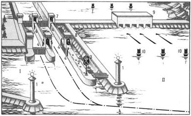 Сигнализация на двухниточном шлюзе и подходах к нему со стороны верхнего бьефа водохранилища показана на рис. 10. На оголовках дамб при входе в аванпорт 1 устанавливают опознавательные знаки 1, являющиеся ориентирами для судов, идущих со стороны водохранилища 11. На оголовке причальных палов 2 установлен светофор дальнего действия 3, входной светофор 5 регулирует вход в левую по ходу камеру шлюза, а светофор 8 — в правую.