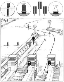 Выход из шлюза и из аванпорта в сторону водохранилища / осуществляется согласно сигналам и знакам, показанным на рис. 12. Здесь обозначено: 1 — светофор, регулирующий выход из левой (по ходу) камеры /V', 2 — опознавательные знаки на дамбах аванпорта //; 3 — светофор, регулирующий выход из правой (по ходу) камеры шлюза ///.