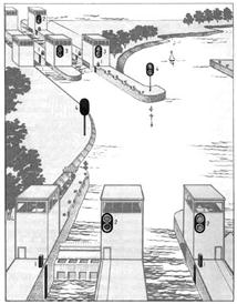 Общий вид двухниточных шлюзов со средним (разъездным) бьефом и сигнализация на них показаны на рис. 13.