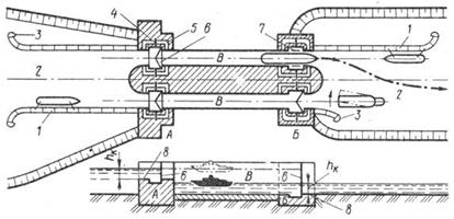 3 - палы; 4-затвор; 5 - водопровод; 6 - ворота; 7 - шкаф; 8 -порог; hк - глубина на короле