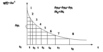 Планы типа 2n удобно применять в тех случаях, когда дрейф, представленный функцией времени, можно свести к линейной зависимости соответствующим преобразованием переменной t. Задача, по сути дела, сводится к определению такой последовательности интервалов Dtg, что составляющая дрейфа от опыта к опыту изменяется на одну и ту же величину Dyt. Наиболее удобно в этом случае экспериментировать в области монотонного изменения функции дрейфа y(t). Проиллюстрируем сказанное на примере экспоненциального дрейфа (рис. 5.2):