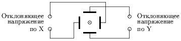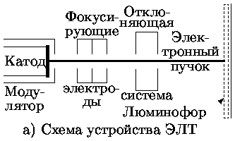 Наиболее просто устроена черно-белая электронно-лучевая трубка (рис. 0.7.1а). Нагретый катод испускает электроны, которые проходят через модулятор, управляющий яркостью и фокусируются фокусирующими электродами, так, чтобы пятно на экране было порядка 0.1 - 0.3 мм. Далее электронный пучок отклоняется отклоняющей системой. Для черно-белых трубок дисплеев обычно используется электромагнитное отклонение с помощью катушек, надетых на горловину кинескопа, но используется и электростатическое отклонение с помощью отклоняющих пластин, как это показано на рис. 0.7.1б. Отклоненный пучок попадает на внутреннюю поверхность колбы, покрытую сплошным слоем люминофора, и вызывает его свечение. Ускоряющее напряжение для таких кинескопов 10 Кв, ток пучка 10 мка. При диаметре пятна 0.25 мм выделяемая мощность 150 Вт/см2 (электроплитка 7 Вт/см2).