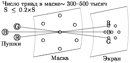 Рис. 0.7.5: Схема формирования отдельных цветов в масочном кинескопе