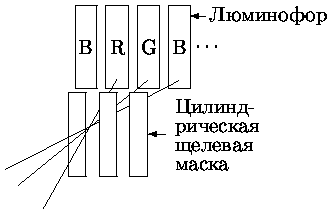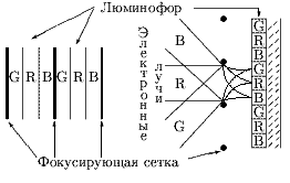Одной триаде из RGB полосок люминофора соответствует одна проволока фокусирующей сетки.