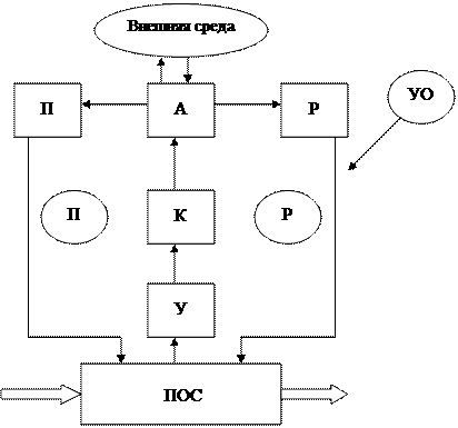 Из модели видно, что управление ПОС может осуществляться в двух контурах (режимах) – планирования (ПОС-У-К-А-П-ПОС) и регулирования (ПОС-У-К-А-Р-ПОС), обозначенных символами