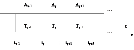 Отсюда следует, в частности, что агрегированный цикл ПОС может изменяться при существенном изменении ситуации в порту, что происходит в моменты времени tγ (γ=1,2,…), когда в порт поступает информация о прибытии «новых» судов, которые в текущий агрегированный цикл ПОС не включались. Вследствие этого агрегированный цикл ПОС оказывается подвижным: он «скользит» вдоль оси времени, проходя последовательность состояний …, Аγ-1, Аγ, Аγ+1, …, и охватывая определённые промежутки времени …, Тγ-1, Тγ, Тγ+1, …, соответствующие периодам сохранения в порту относительно стабильной производственной ситуации (рис. 1.4).