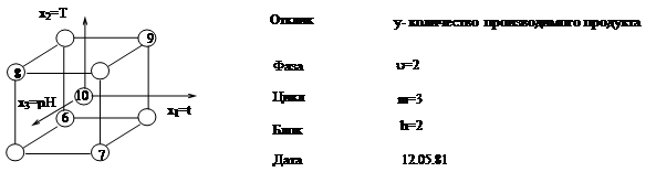 | Единицы измерения Базовые уровни Интервалы варьирования Нижние уровни Верхние уровни | [xi] xi0 Dxi xiн xiв | б/разм. -1 +1 | мин | °С | рН | |||||||||