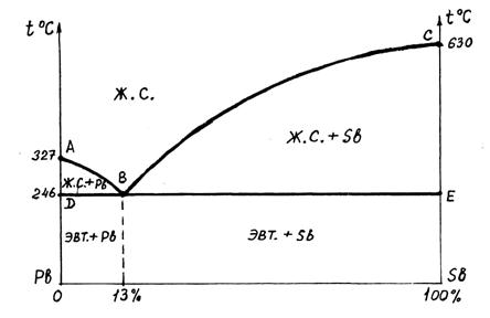 Между этими линиями происходит процесс первичной кристаллизации. В точке B, при строго определённой концентрации и самой низкой температуре, компоненты кристаллизуются одновременно образуя мелкую равномерную смесь зёрен входящих компонентов – эвтектику (хорошо построенный сплав).